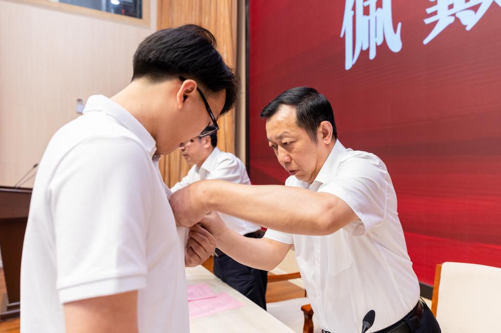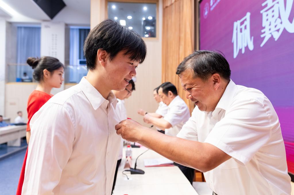 在雄壮的国歌声中,开学典礼正式开始。在“苍山巍巍,灵江沺沺”的校歌旋律中,校领导分别为来自三个学位点的新生代表佩戴校徽。一枚枚鲜亮而独具特色的“台州学院”校徽佩戴在胸前,标志着99位新生正式加入台院,成为台院的一份子,象征着同学们踏入人生新征程,预示着同学们即将面对更大的挑战、肩负更重的任务、承担更光荣的使命。