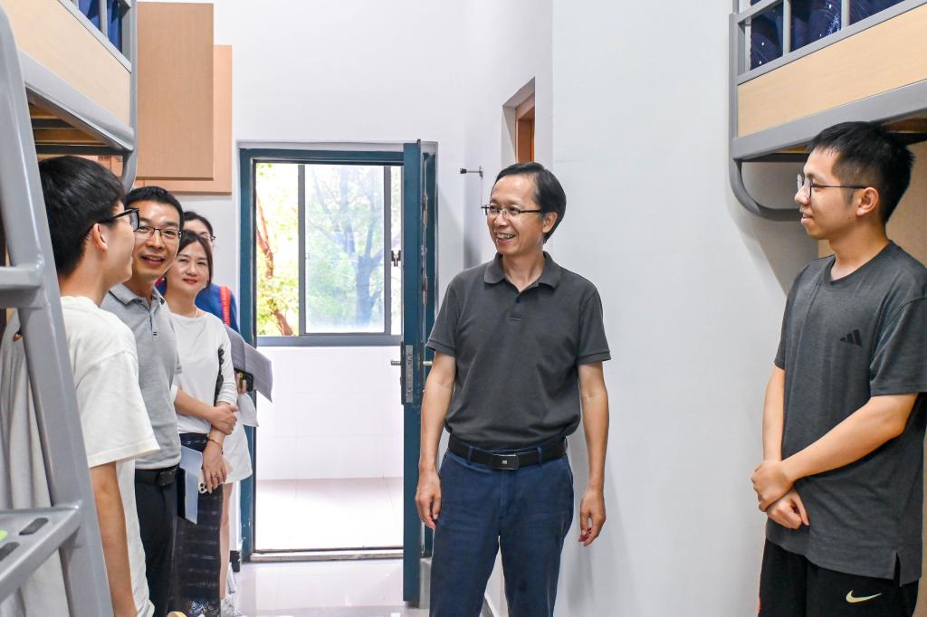 9月13日上午,各学院研究生报到点秩序井然,工作人员和志愿者热情服务,暖心关怀。下午,校党委副书记项凤日走访研究生新生寝室。“家是哪里的?”“本科是哪所大学?”“为什么选择台院?”“学校的饭菜合不合口味?”一到学生寝室,项凤日便亲切询问了新生的基本情况、来校体会和遇到的困难等,并嘱咐同学们出门在外要学着照顾好自己,有困难就找老师和学校。谈及硕士阶段的成长,项凤日强调,新阶段意味着新要求、新挑战,他鼓励新生珍惜宝贵的求学时光,深耕专业知识领域,主动加强与导师的沟通协作,在持续探索中提升学科素养与思想格局,着力锤炼学术专长与实践应用能力,为未来的长远发展筑牢根基、积蓄力量。