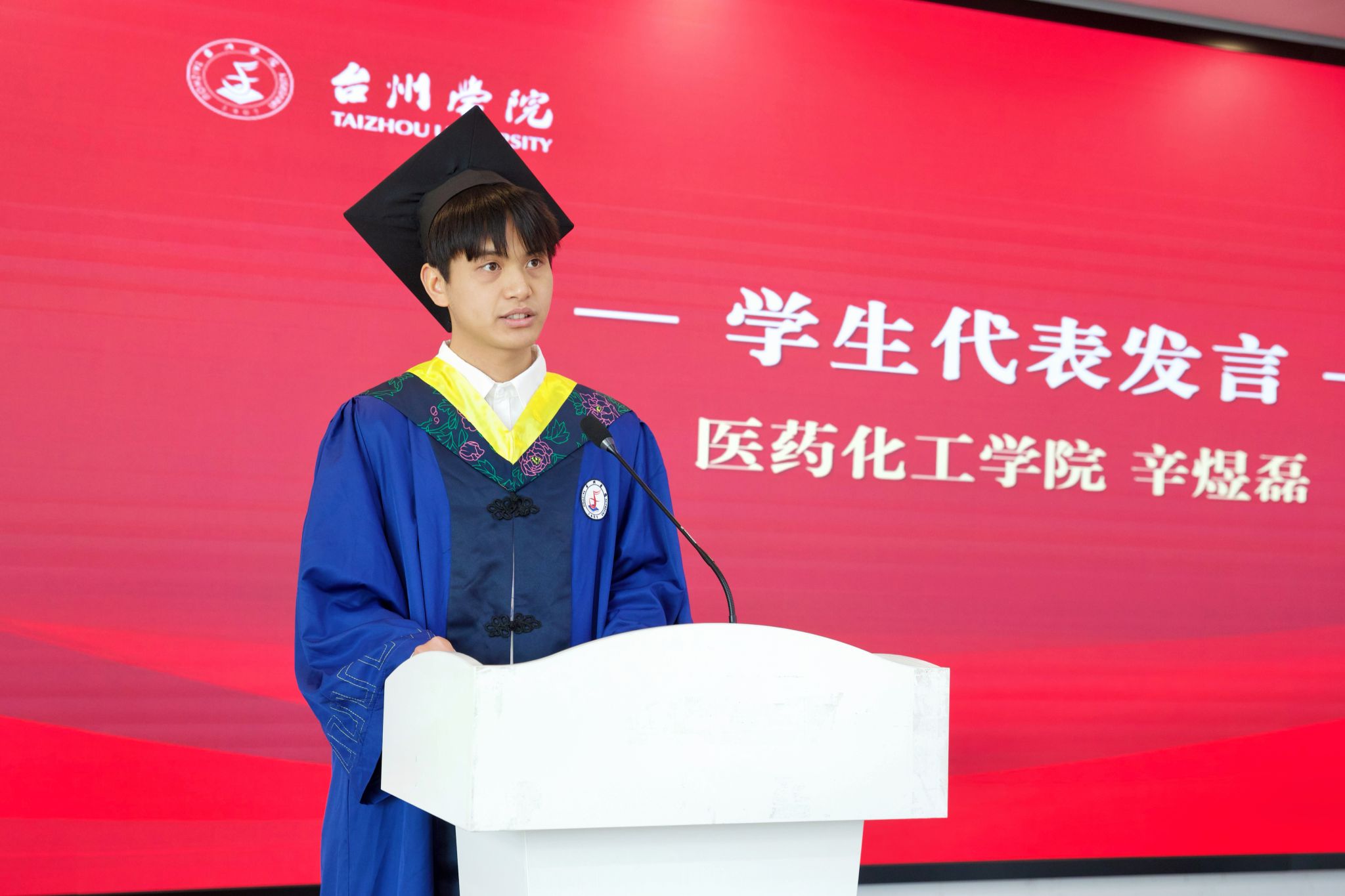 毕业生代表、医药化工学院化学工程专业辛煜磊同学分享成长感悟。他以“平台、挑战与突破”凝练六年半求学时光,感恩母校提供的竞赛与科研平台支持,并感言:“无论未来身处何种岗位,在台院所淬炼的敢于挑战、勤于钻研、勇于突破的精神,终将成为我们最坚实的铠甲、最明亮的灯塔。”
